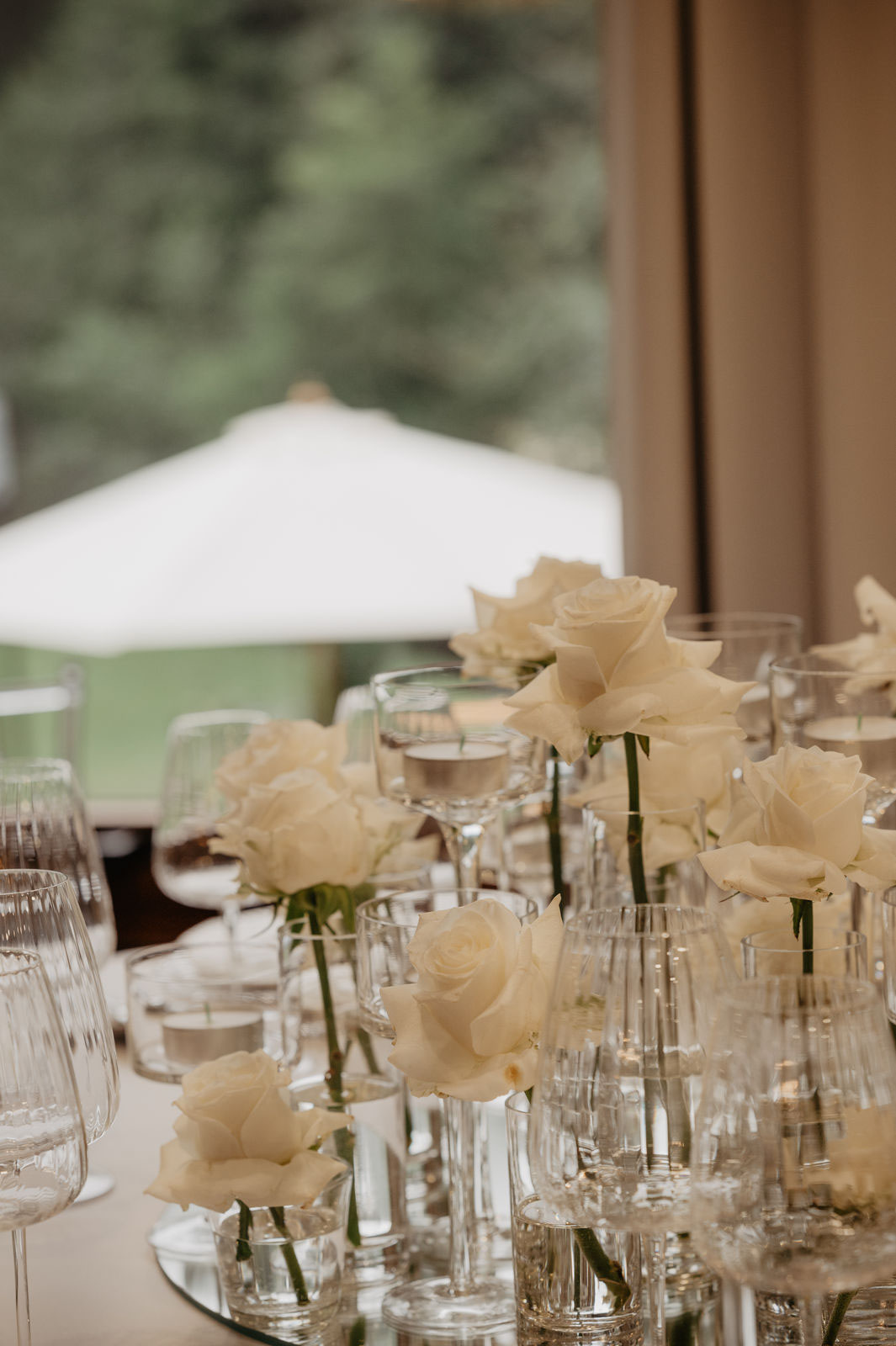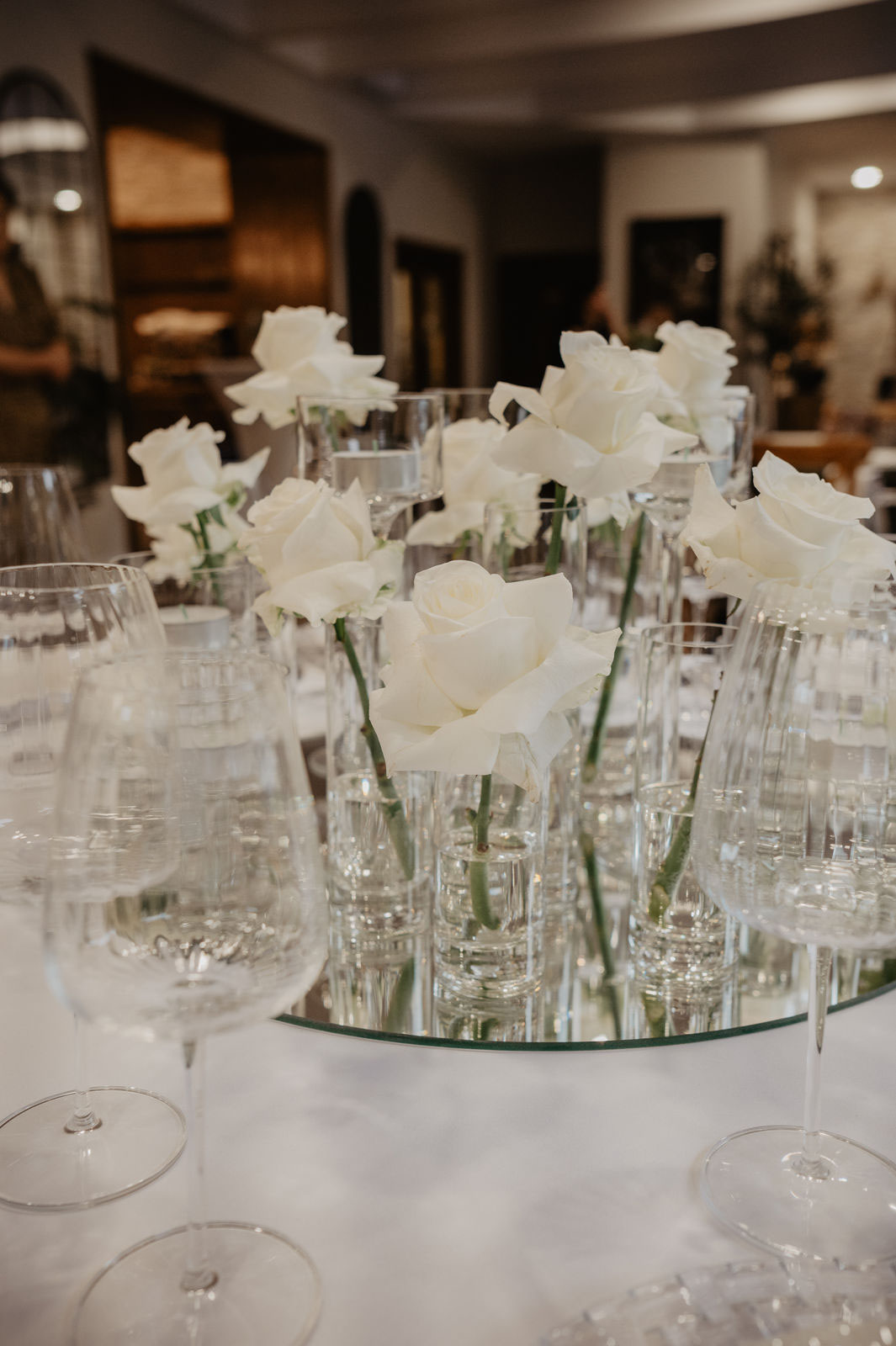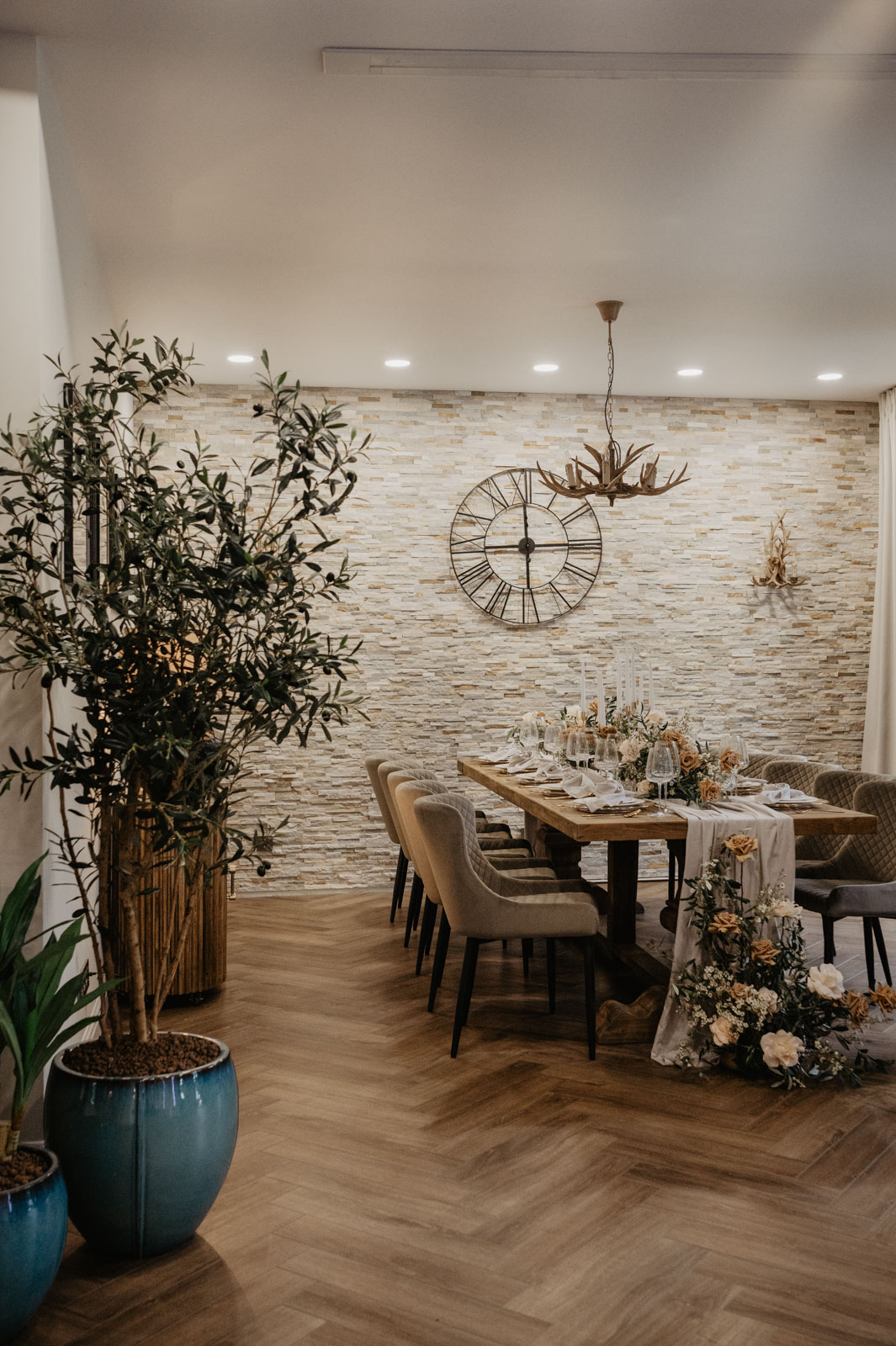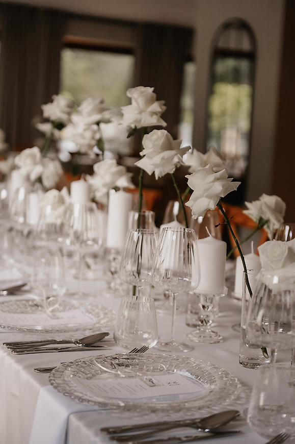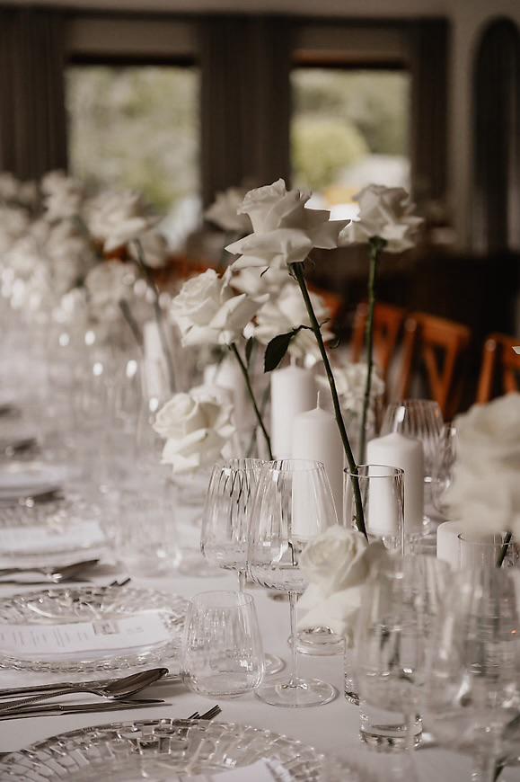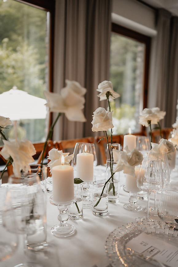 Die Dekoration setzte auf klare Linien und edle Akzente. Besonders beeindruckend war die Floristik: Einzelne, sorgfältig ausgewählte Blumen wurden in unterschiedlichen Höhen arrangiert. Diese lockere, natürliche Anordnung verlieh dem Raum eine stilvolle Leichtigkeit und betonte den minimalistischen Charakter der Feier.