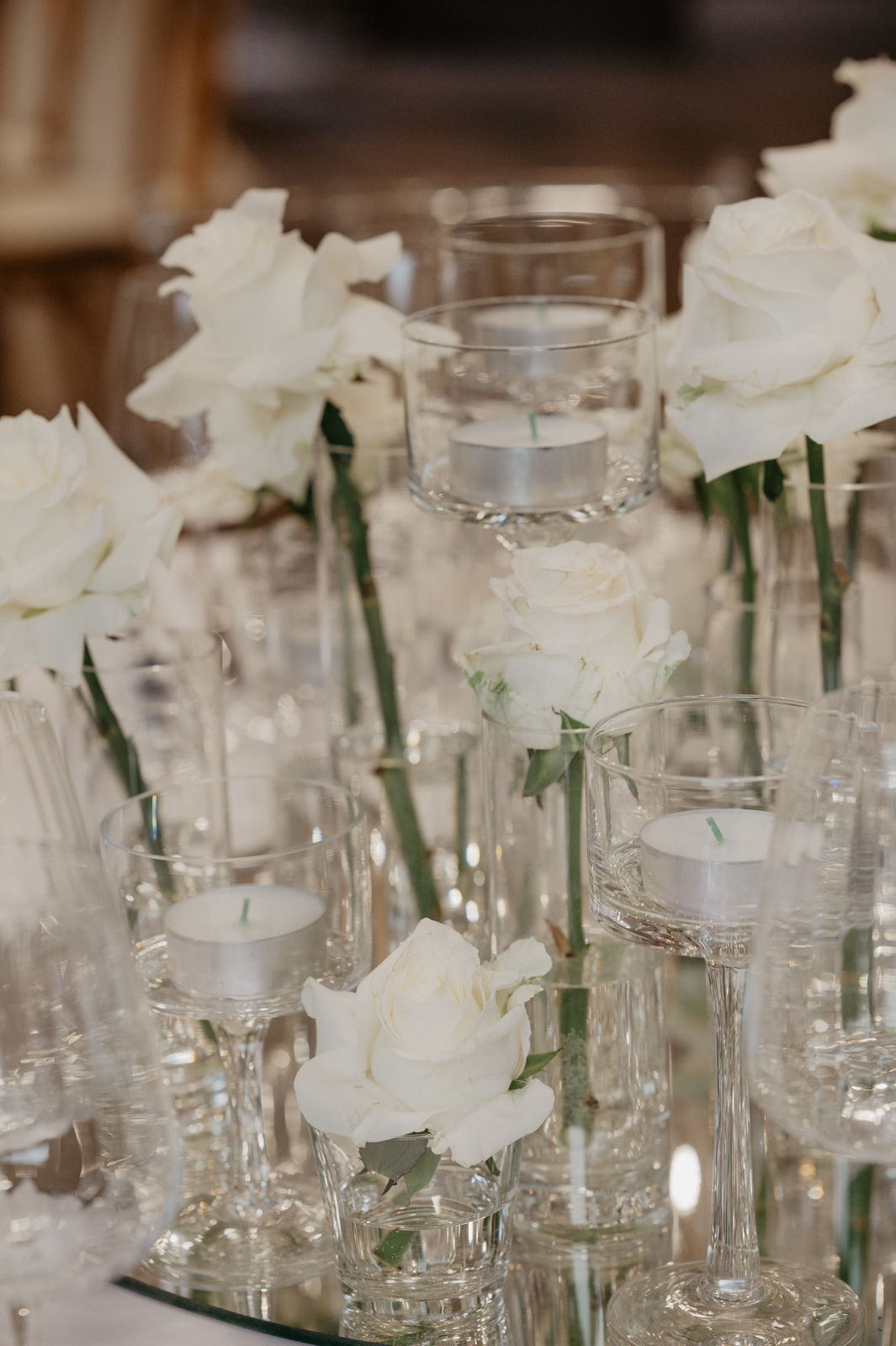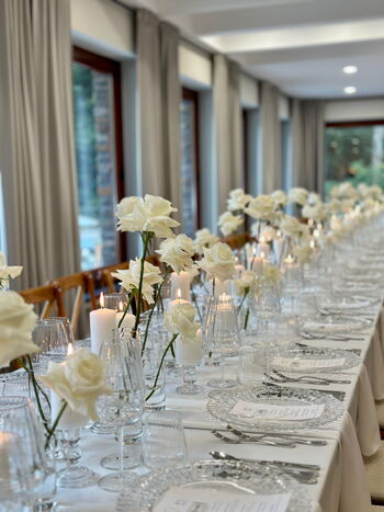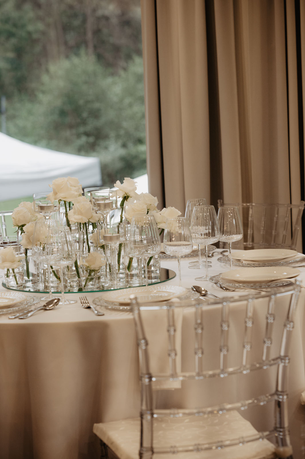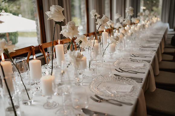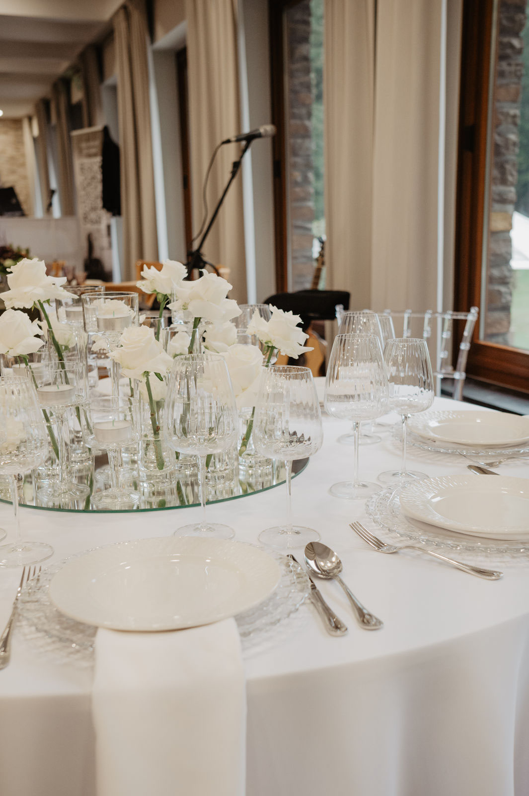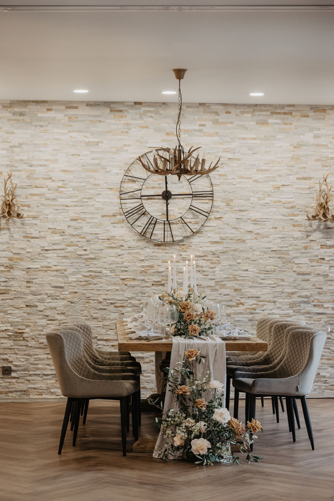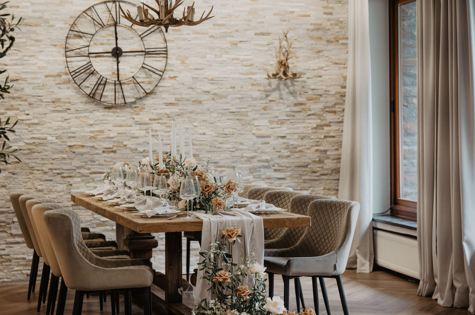 Die Dekoration setzte auf klare Linien und edle Akzente. Besonders beeindruckend war die Floristik: Einzelne, sorgfältig ausgewählte Blumen wurden in unterschiedlichen Höhen arrangiert. Diese lockere, natürliche Anordnung verlieh dem Raum eine stilvolle Leichtigkeit und betonte den minimalistischen Charakter der Feier.