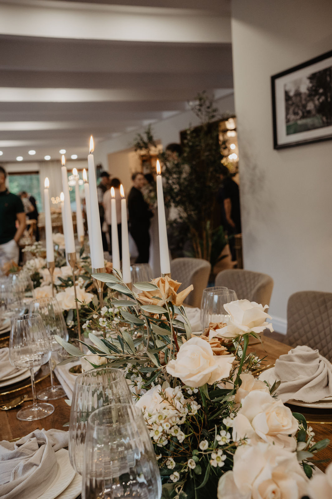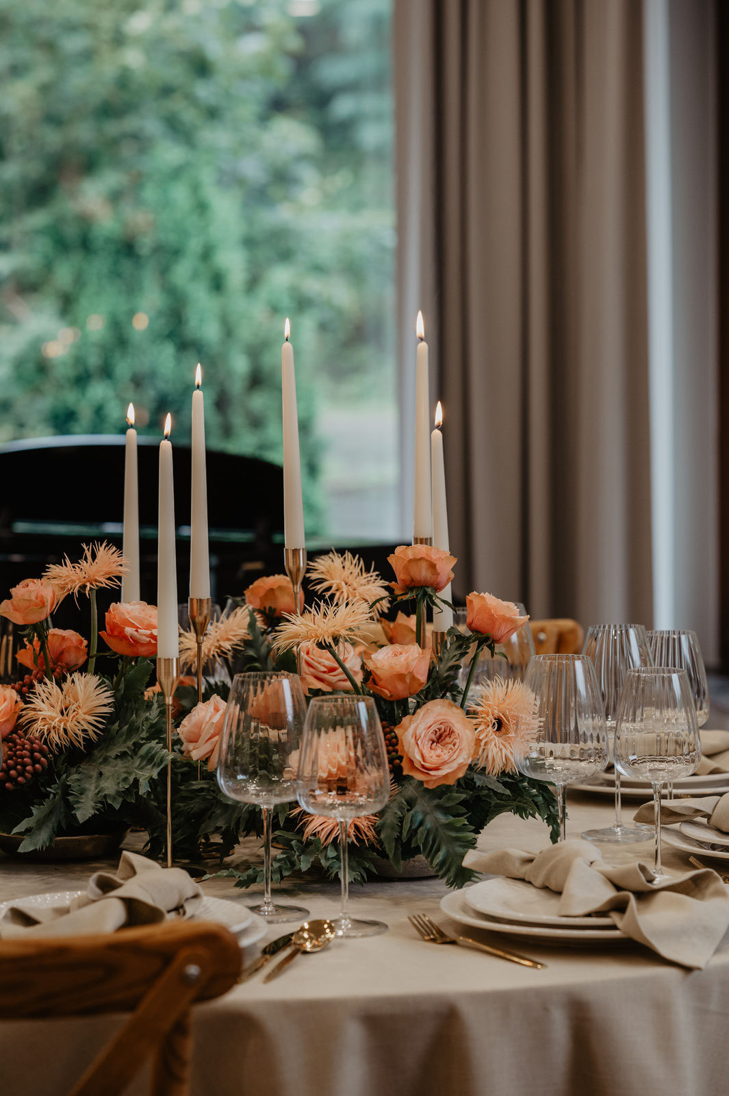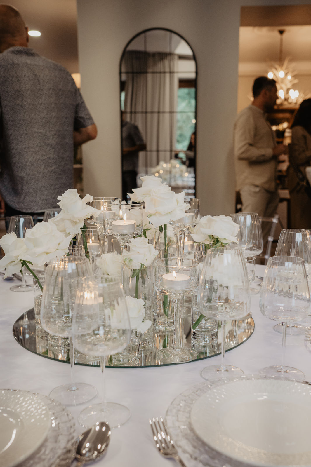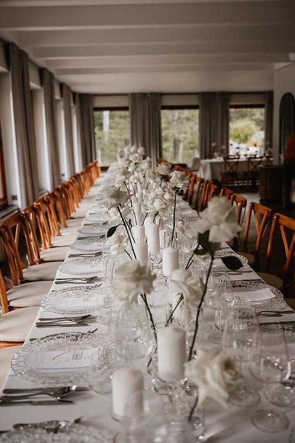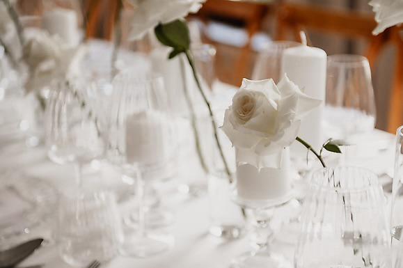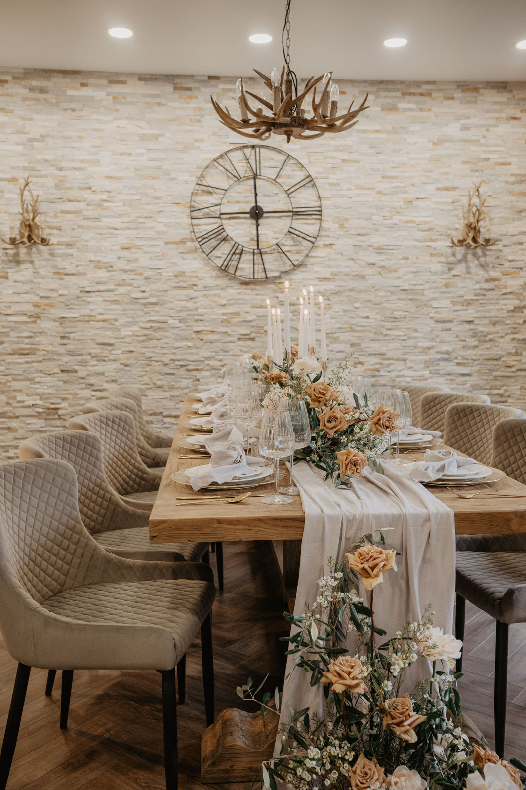 Die Dekoration setzte auf klare Linien und edle Akzente. Besonders beeindruckend war die Floristik: Einzelne, sorgfältig ausgewählte Blumen wurden in unterschiedlichen Höhen arrangiert. Diese lockere, natürliche Anordnung verlieh dem Raum eine stilvolle Leichtigkeit und betonte den minimalistischen Charakter der Feier.