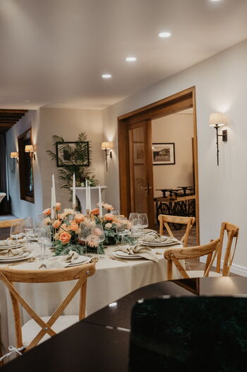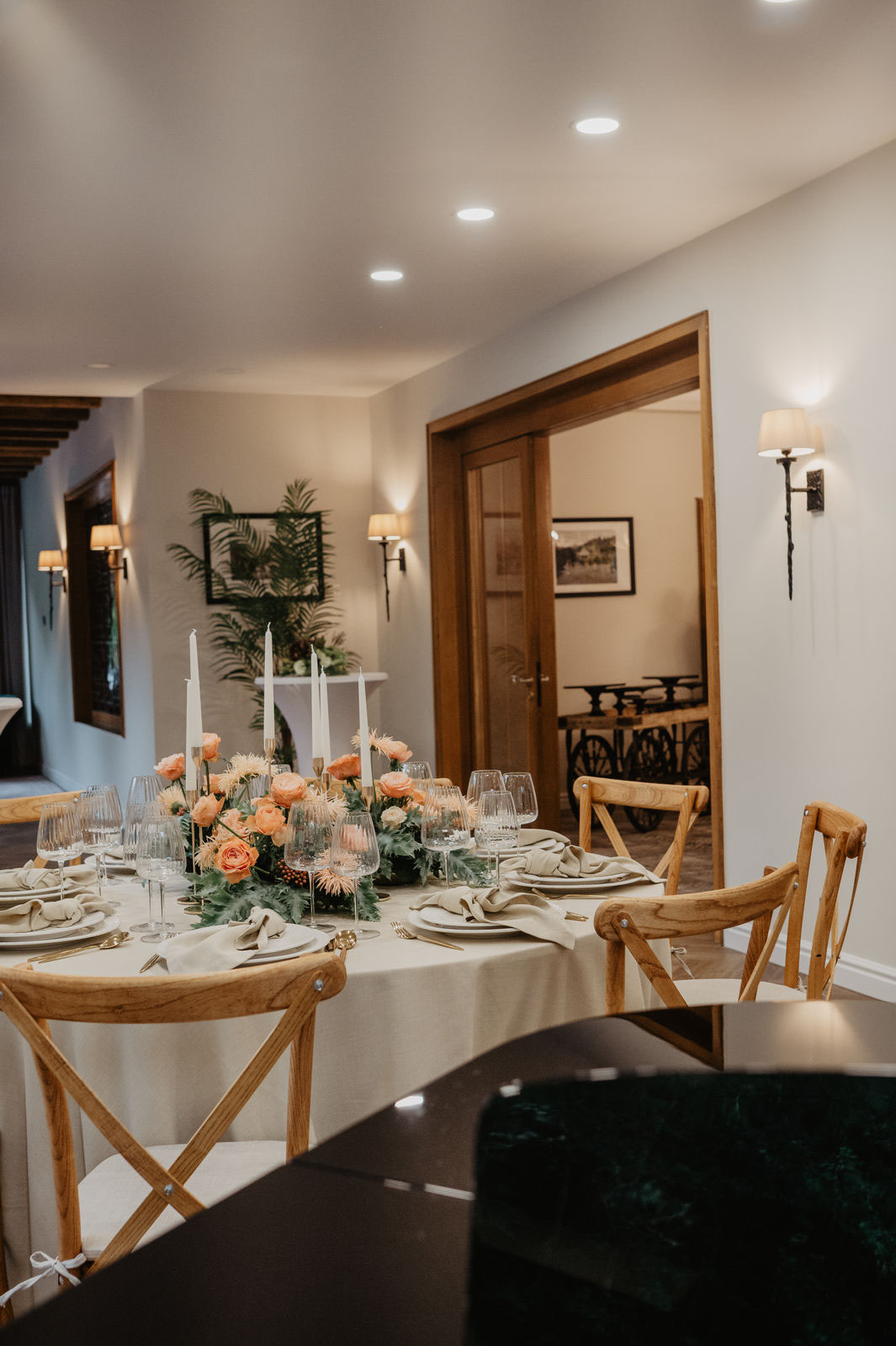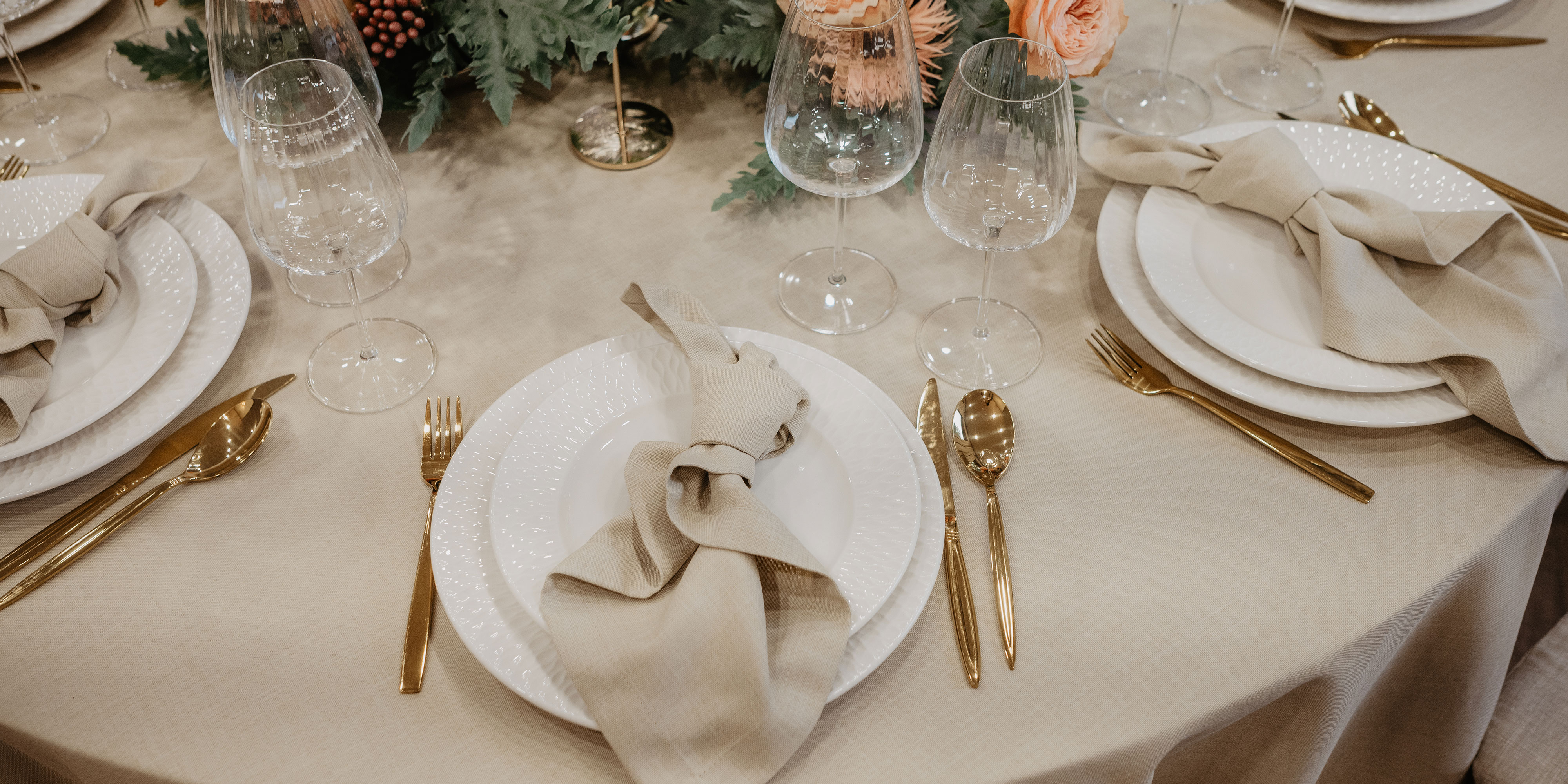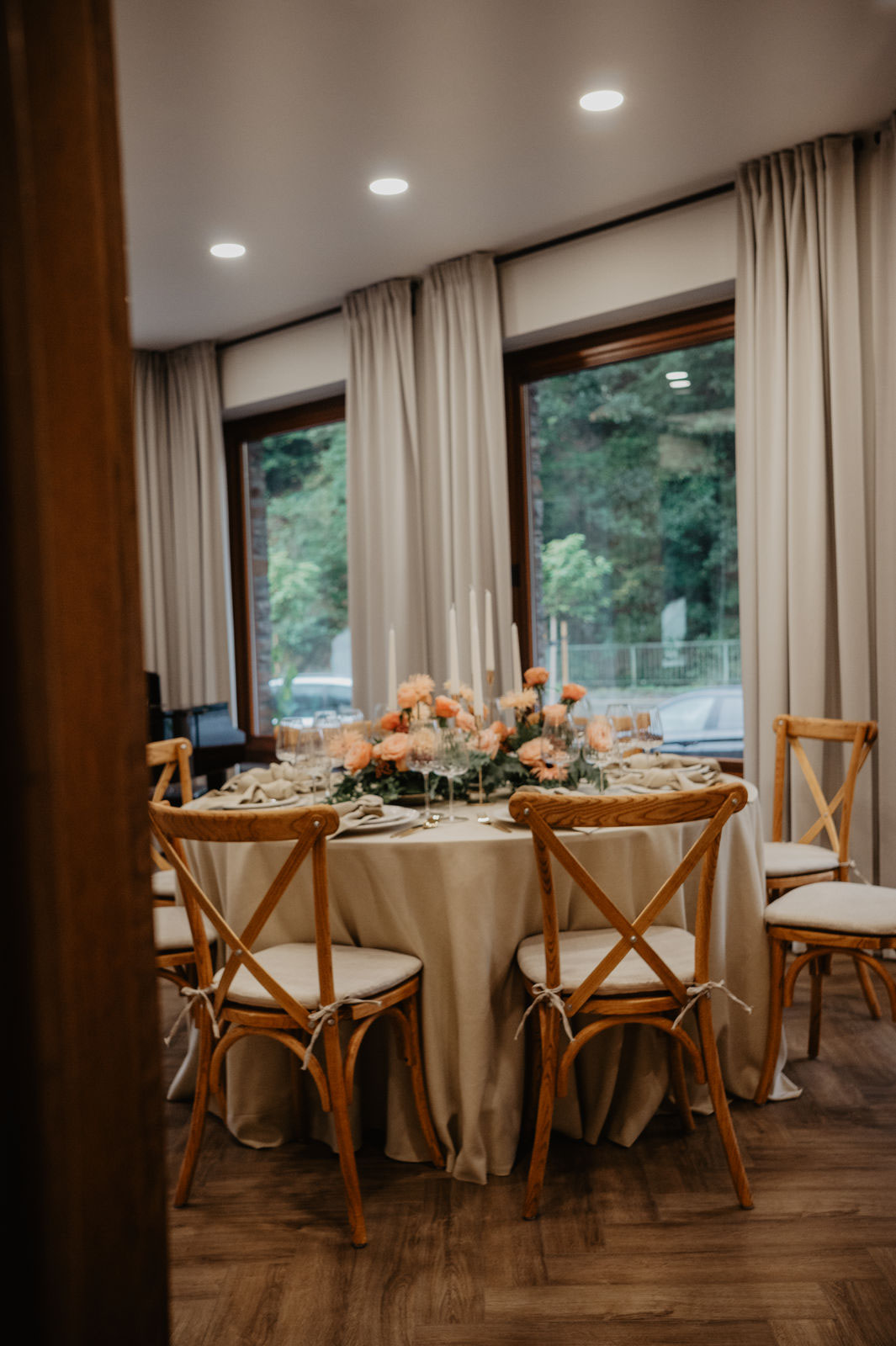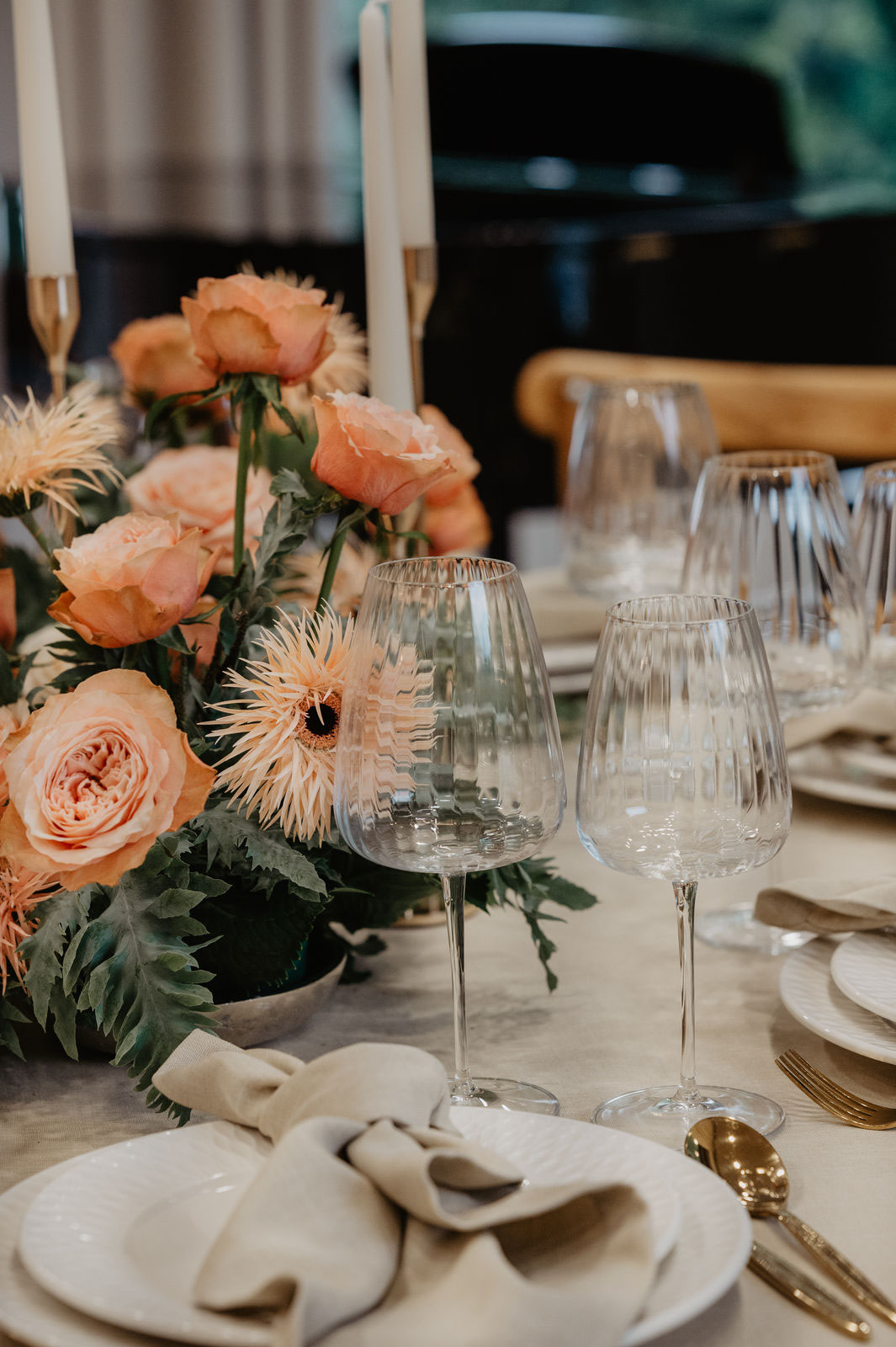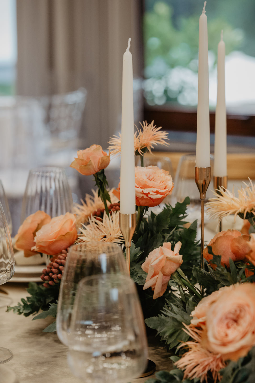 Die Hochzeitsdekoration wurde mit Leinen-Tischdecken in Naturtönen, zarten Goldakzenten und einer harmonischen Floristik in Pastell-Orange und Gelb gestaltet. Diese Kombination verlieh dem Fest eine besonders edle, sommerlich leichte Atmosphäre. Das Farbkonzept passte perfekt zur modernen Eleganz der Location in Lorch am Rhein.