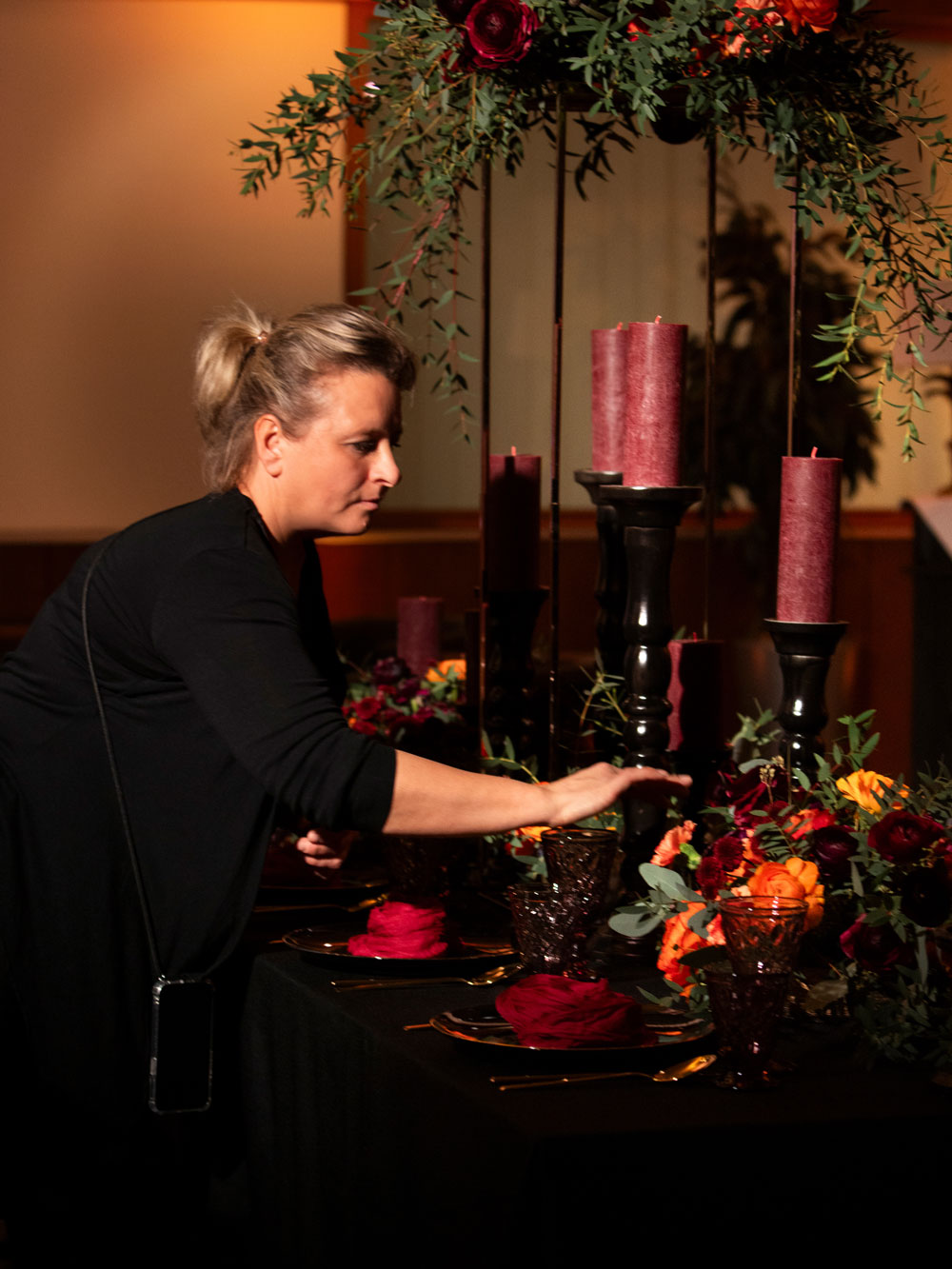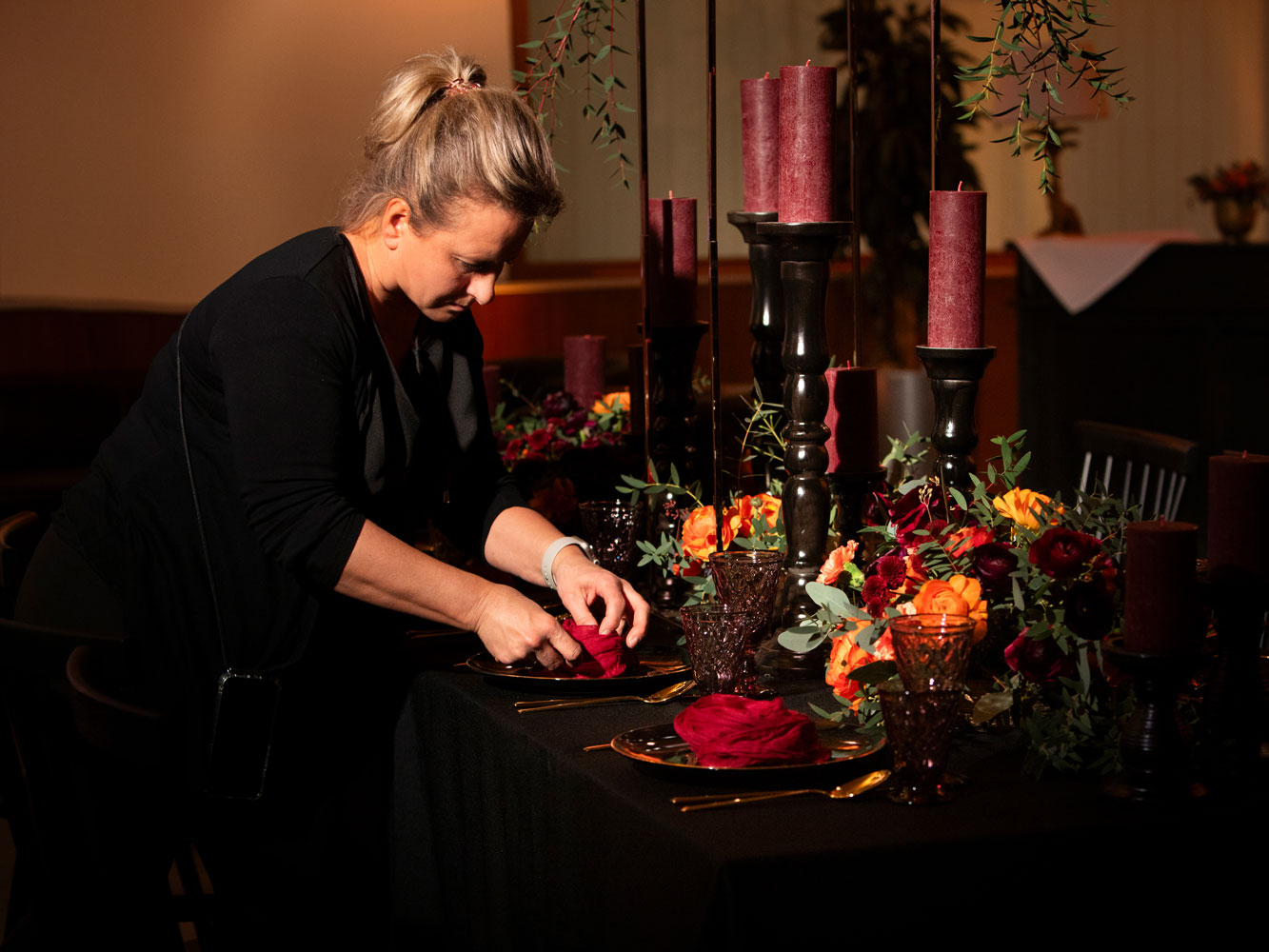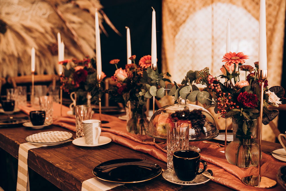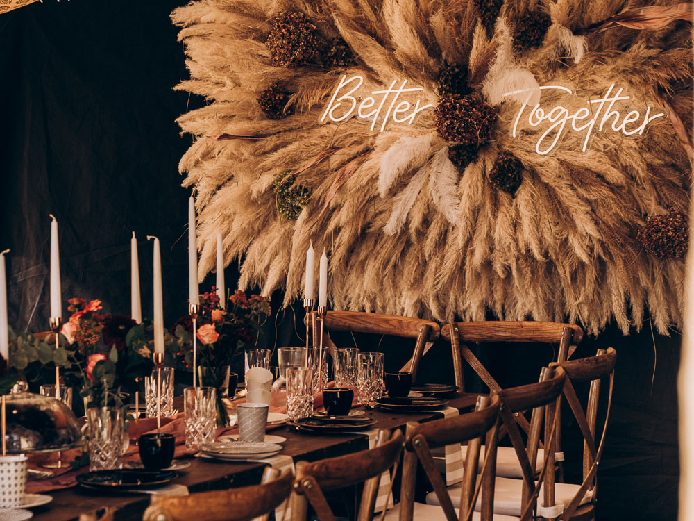 Inspiriert von den edlen Farben Schwarz, Burgundy, leuchtendem Orange, tiefem Rot, sattem Grün und glänzendem Gold, entstand ein Konzept, das Emotionen weckt: dramatisch, luxuriös und detailverliebt. Dieses Farbschema eignet sich ideal für Paare oder Unternehmen, die ein Statement setzen und sich bewusst gegen das Gewöhnliche entscheiden.