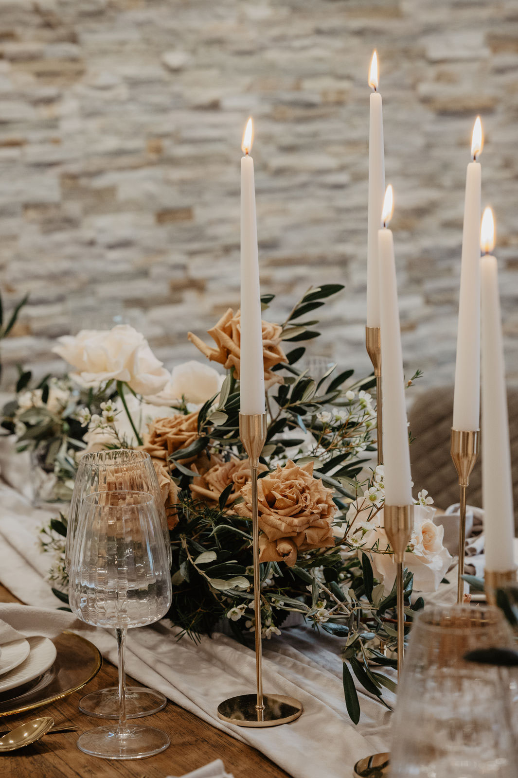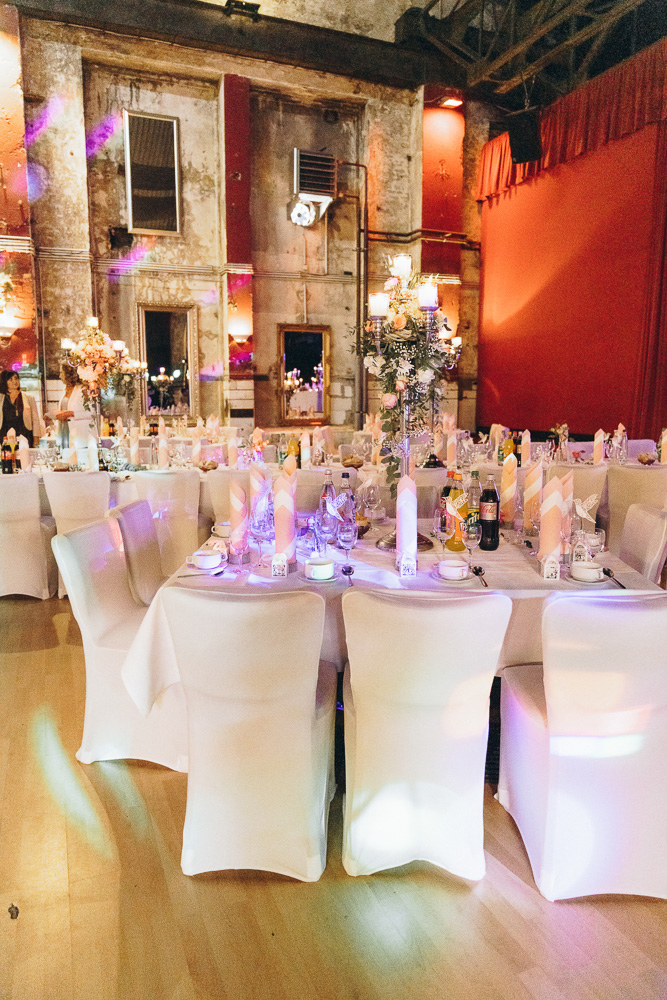 Bei der Hochzeitsplanung dieser besonderen Location lag der Fokus darauf, den industriellen Stil der Halle stilvoll zu unterstreichen und gleichzeitig eine warme, festliche Atmosphäre zu schaffen. Mit aufwendiger Floristik, hohen, goldenen Kerzenständern und dramatischen Blütenarrangements entstand ein faszinierender Kontrast: rauer Industrie-Look trifft auf opulenten Barockstil.