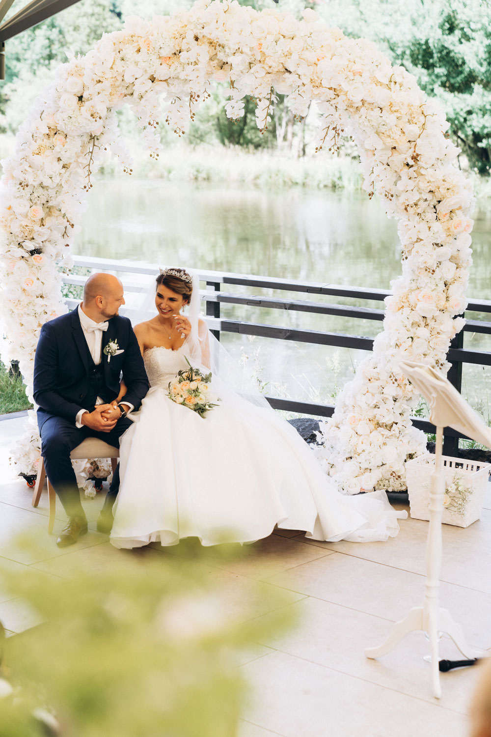 In Altenkirchen entstand eine besonders stimmungsvolle Trauung direkt am Waldrand, mit Blick auf einen großen, privaten Teich. Eine imposante Birke stand am Ufer und bildete den natürlichen Rahmen für einen unvergesslichen Moment: die freie Trauung inmitten der Natur. Dieser romantische Ort, ruhig und abgeschieden, bot nicht nur Raum für Emotionen, sondern auch für liebevolle Details darunter ein glamouröser Traubogen aus zarten Blumen in Pastellfarben, der mit Weiß- und Goldakzenten perfekt abgestimmt war.