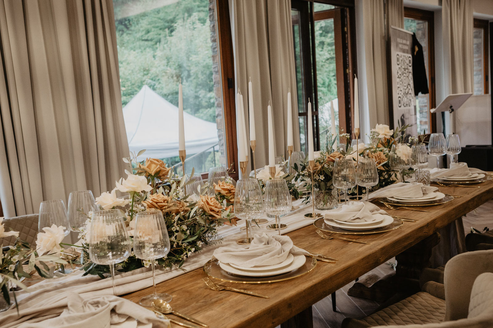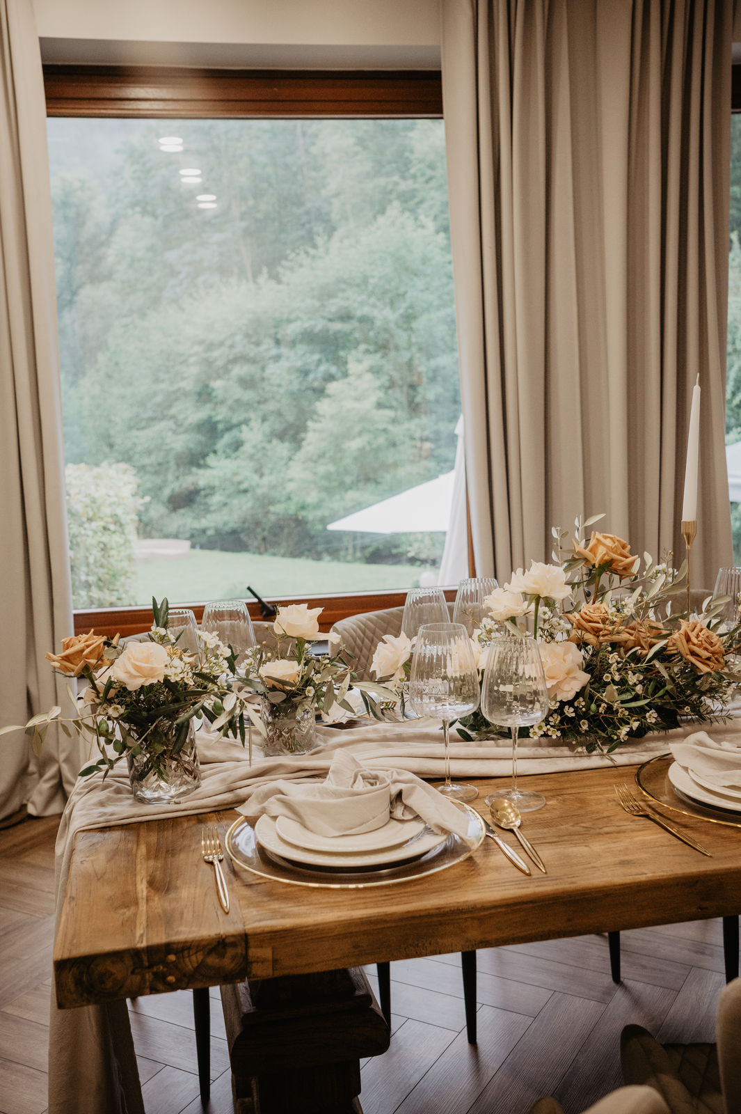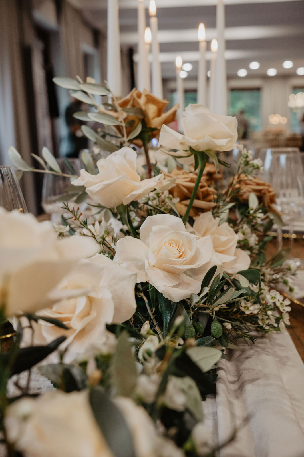 Die üppige Blumendekoration vom Traubogen bis zu den eleganten Tischarrangements schuf eine Atmosphäre voller Leichtigkeit und Liebe. Feine Stoffe, goldene Akzente und stilvolle Lichtdetails unterstrichen den Glamour, ohne aufdringlich zu wirken. Die Kombination aus natürlicher Umgebung und stilvoller Inszenierung machte diese Hochzeit in Koblenz zu einer perfekten Mischung aus Romantik und Eleganz.