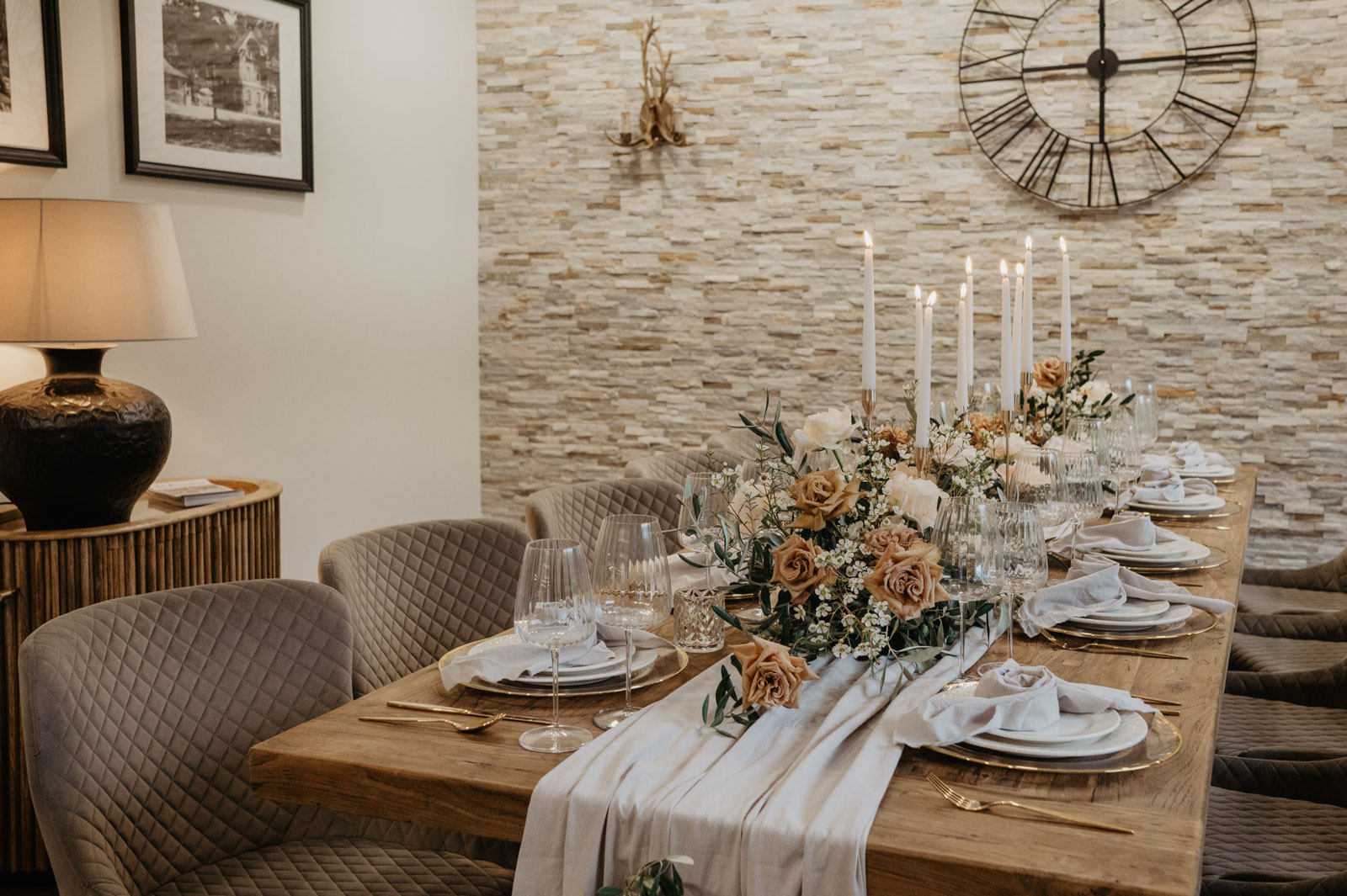 Die Eventplanung in Siegen konzentrierte sich auf die Entwicklung eines durchdachten Designkonzepts, das sowohl bei Tageslicht als auch im warmen Abendlicht seine Wirkung entfaltet. Hochwertige Materialien, goldene Akzente und eine üppige Floristik verwandelten die Location in eine Bühne voller Ausdruck und Atmosphäre.