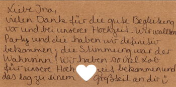 Vielen Dank für die gute Begleitung vor und bei unserer Hochzeit. Wir wollten Party und die haben wir definitiv bekommen. Die Stimmung war der Wahnsinn 🤩! Wir haben so viel Lob für unsere Hochzeit bekommen, und das lag zu einem Großteil an dir.